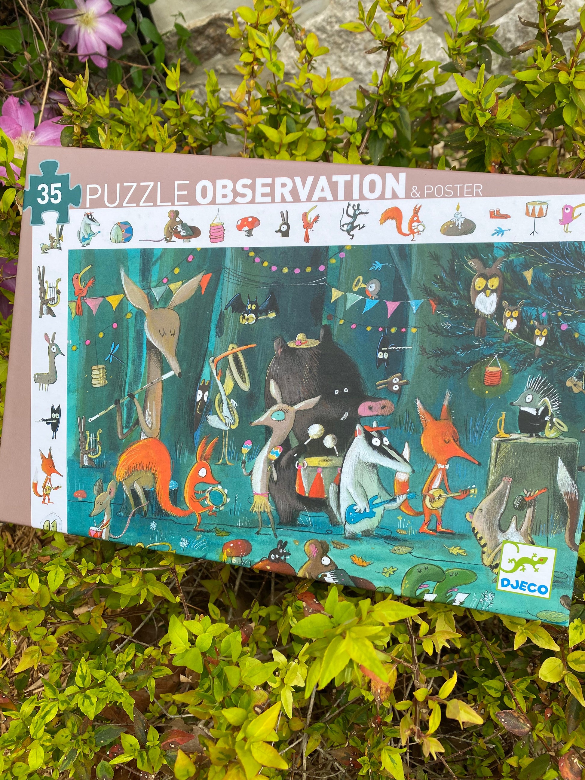 Ages 3+ Djeco 35 piece puzzle and poster. All around one big picture so many things to find! After putting the puzzle together have fun finding the items from the border in the picture.