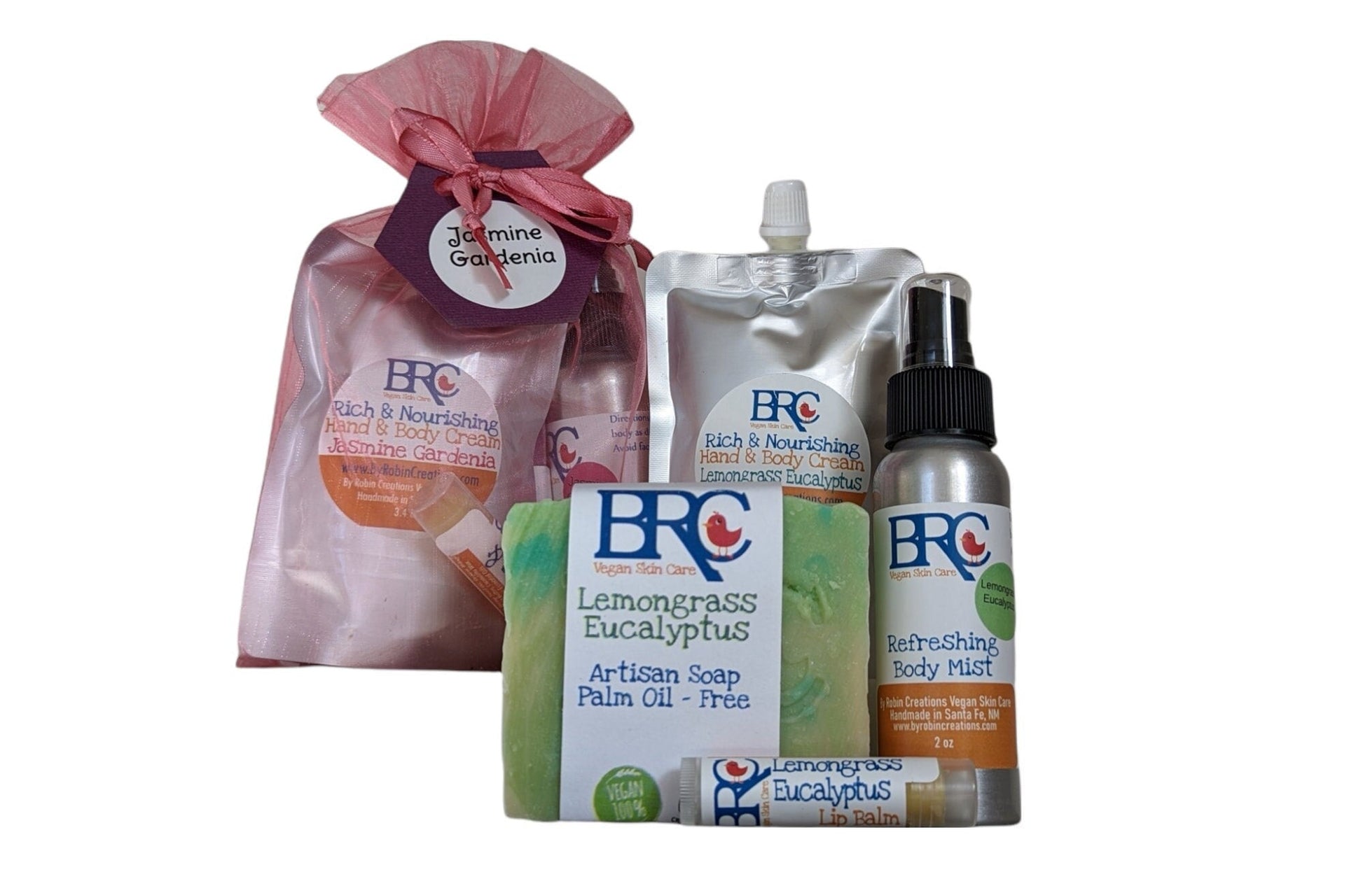 This Essential Body Care Gift Set would make the perfect gift for anyone in your life! Bless them (or yourself) with the gift of healthy natural skincare! You can never go wrong with that. Everything is 100% natural & vegan. Comes with a 3.4 oz Hand & Body Cream, 1 Natural Artisan Bar Soap, a 2 oz Body Mist, and 1 Lip Balm, all in a colorful organza gift bag.