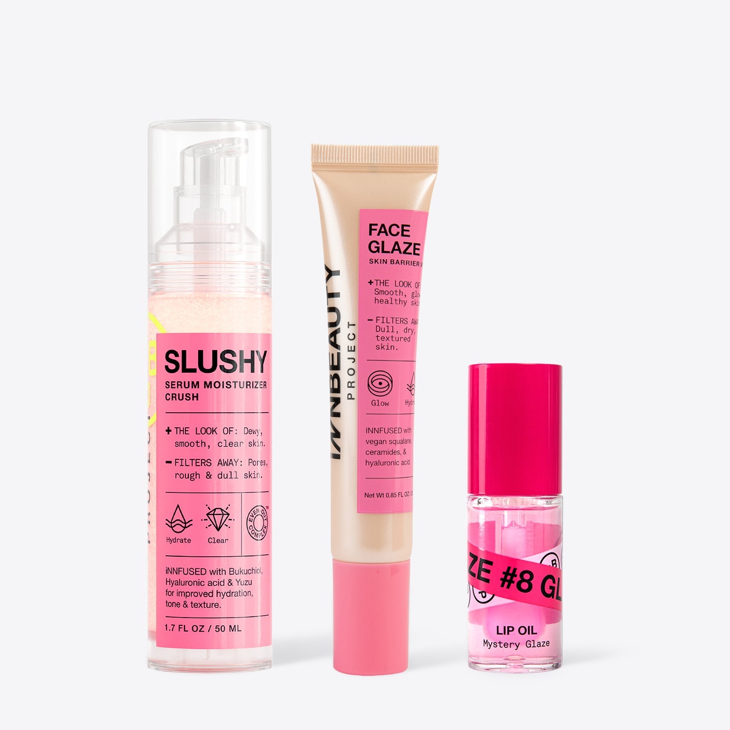 Get Gorgeous Glazed & Dewy Skin! Bundle features: Slushy, Face Glaze + NEW Mystery Glaze Lip Oil for the complete glazed donut glow!