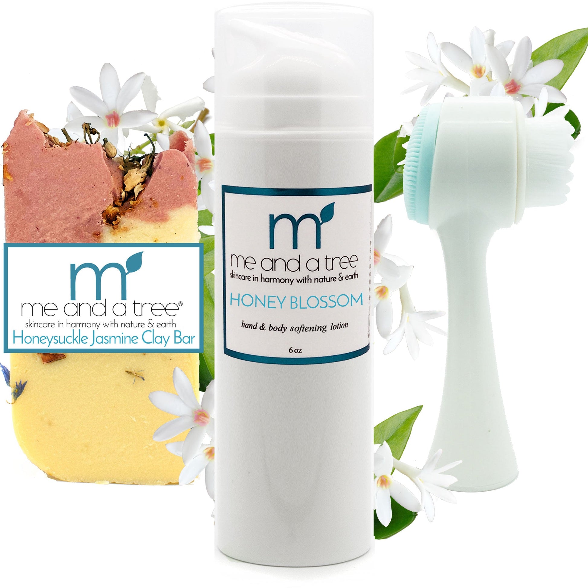 This lovely handcrafted honeysuckle gift set is the perfect feminine gift collection for soft silky skin. The gentle flower scents of blossoms honeysuckle is a perfect way to let someone know you love and appreciate them. Eco-friendly & cruelty-free gifts are appreciated these days, and why not? It's a win-win. Gift sets are a perfect way to share sentiments and kindness. Take pride in knowing you’re committed to helping support small businesses interested in naturally safe ingredients that preserve the environment while eliminating animal testing. Enjoy fresh, uniquely made, luxurious plant-based body care spa products that are naturally calming, eco-friendly, and support a sustainable lifestyle of health & wellness. Our Me and a Tree Honeysuckle Jasmine Soap Lotion Gift Set combination includes: