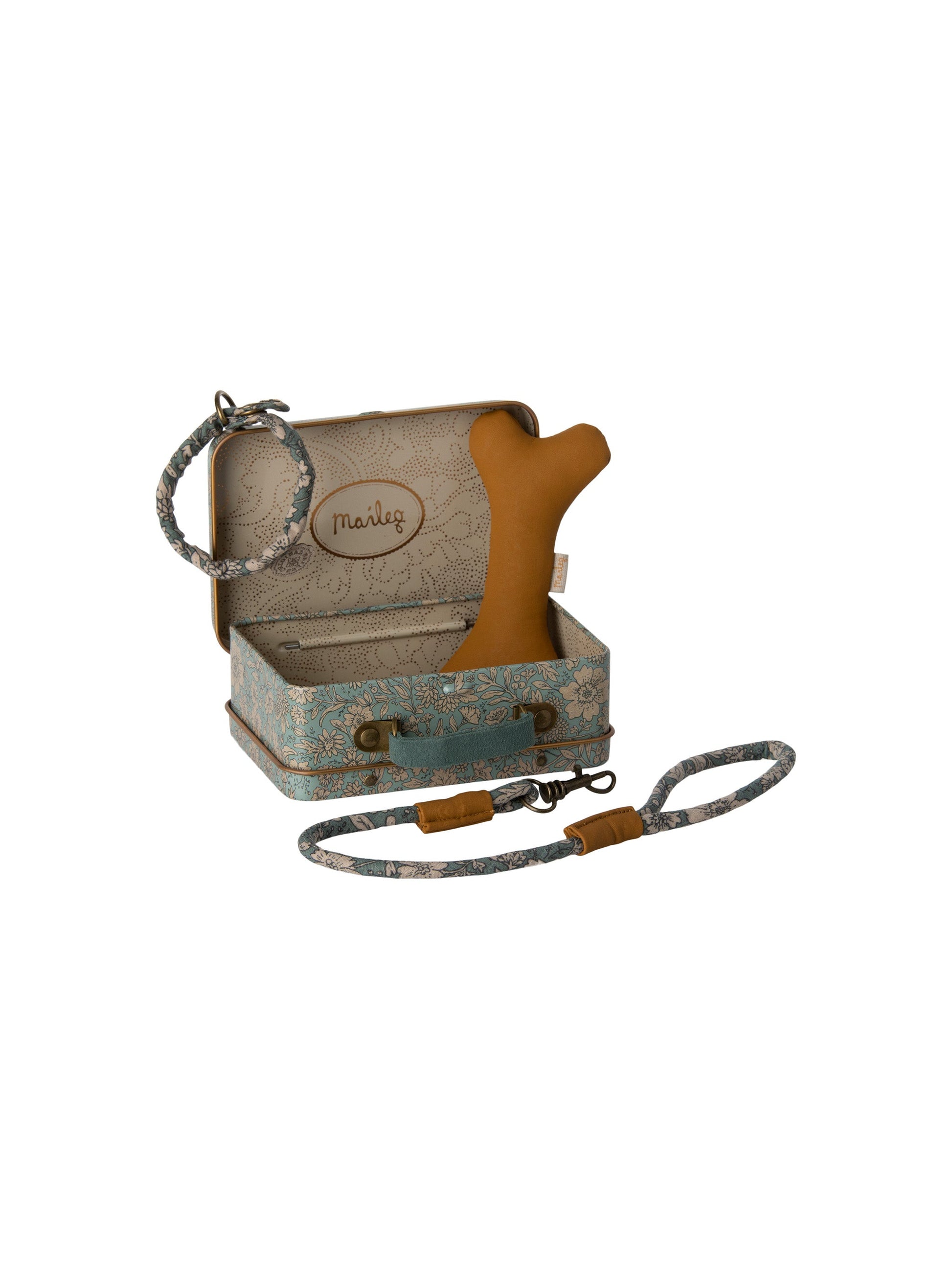 This set is all you need for your soft plush dog. The set includes a bone, collar and leash packed nicely in a metal suitcase with a beautiful Maileg print.