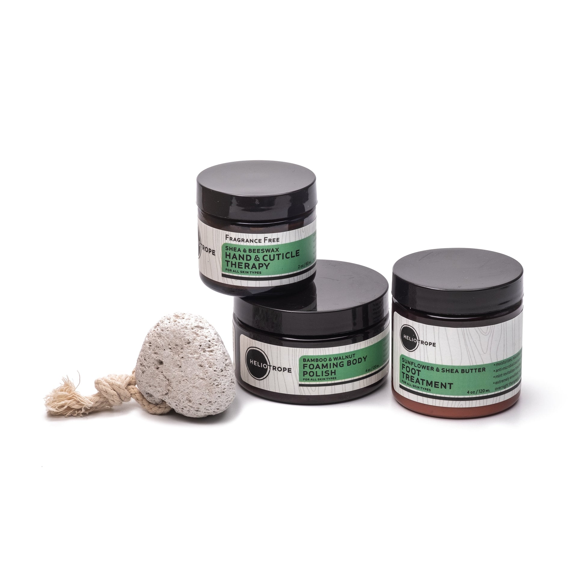 Everything you need to treat your hands and feet beautifully: our Shea & Beeswax Hand & Cuticle Therapy, our new Sunflower & Shea Butter Foot Treatment, our Bamboo & Walnut Foaming Body Polish, and a bamboo nail brush w/pumice attached.